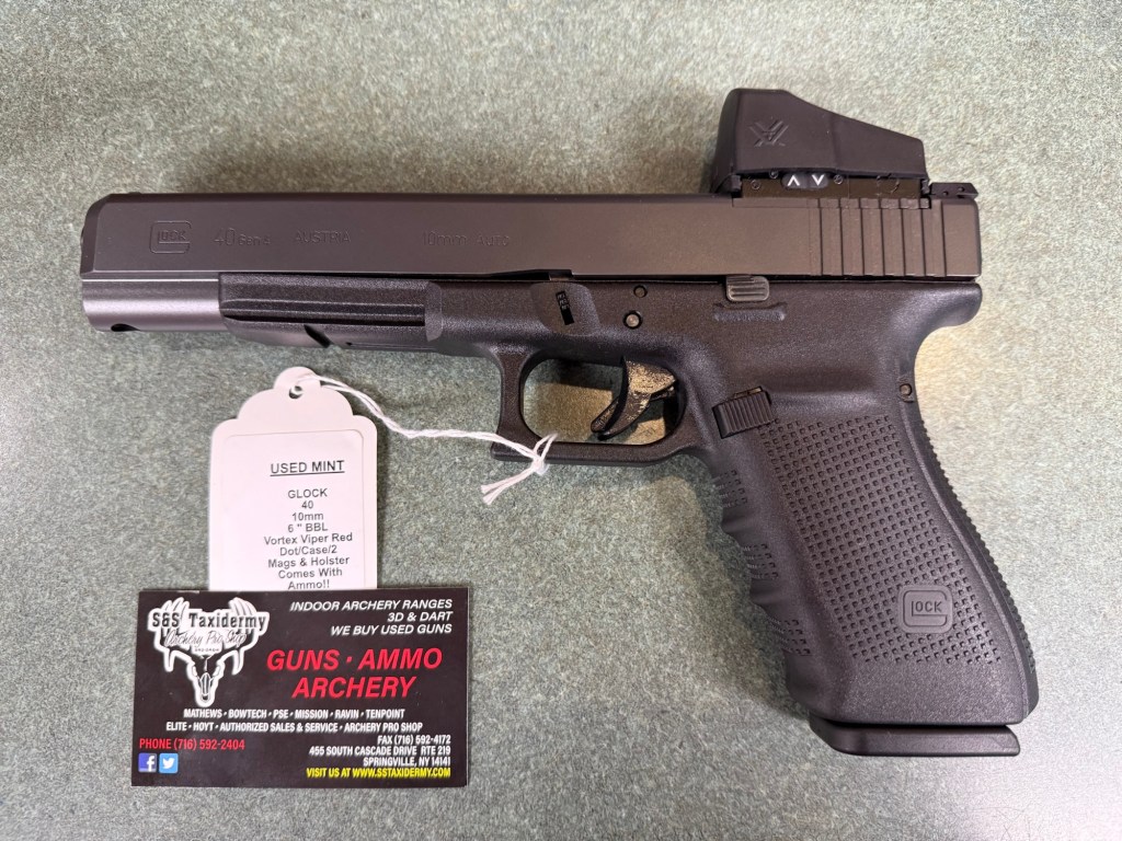 A S&W 500 Cal., a T/C Encore .308, a Springfield Hellcat and a Glock 40 10mm with a Vortex red dot!