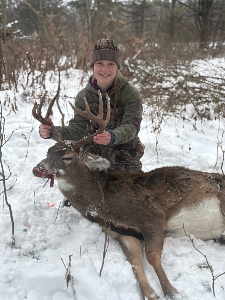 Emma Fritz, 17 years old, purchased a new Vortex scope for her Mossberg 500. After having us boresight it and stacking three bullets on top of each other, she shot this brusier while walking to her stand!